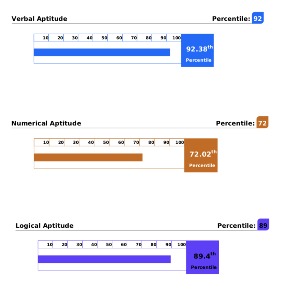 Our comprehensive test battery measures three fundamental types of aptitude: Verbal, Numerical, and Abstract (Logical) reasoning. These cognitive dimensions serve as crucial predictors of an individual's performance in academic and professional settings. By delving deep into these domains, our test provides you with a strong indication of your true potential, shedding light on the underlying abilities that drive success.